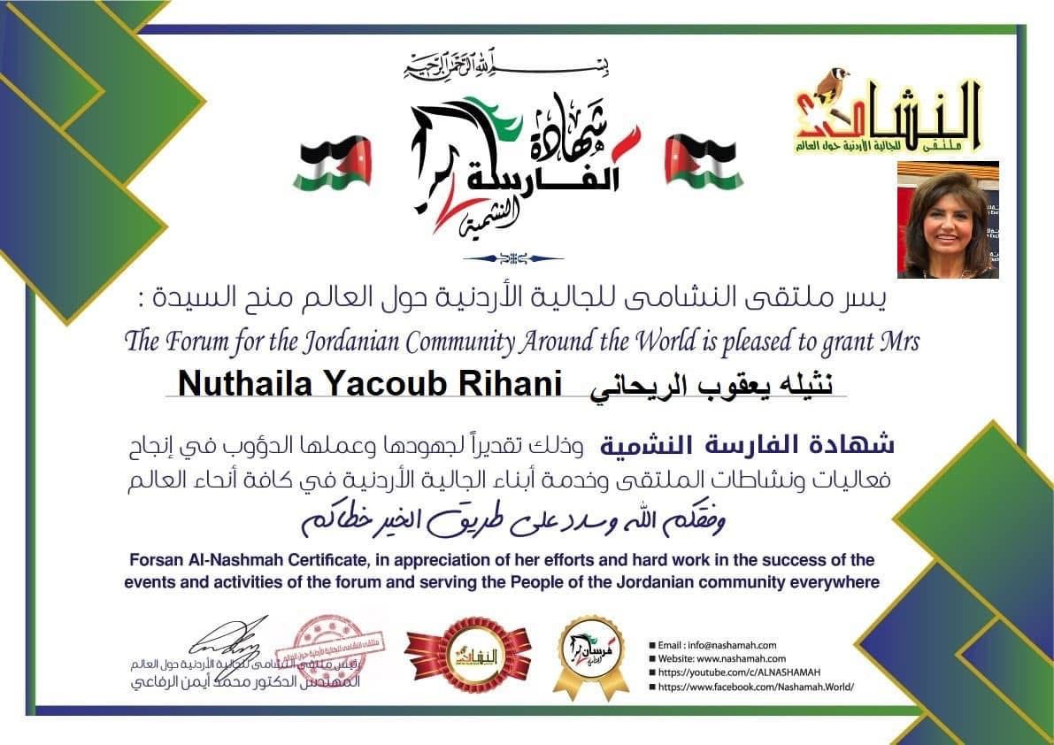 منح ملتقى النشامى للجالية الأردنية حول العالم السيدة نثيلة يعقوب الريحاني وهي رئيسة ملتقى النشامى في كندا لقب “الفارسة النشمية” تقديراً لعطائها المميز وجهودها البارزة في دعم أنشطة الملتقى وخدمة أبناء الجالية الأردنية في مختلف أنحاء العالم. ويأتي هذا التقدير اعترافاً بدورها الفاعل في تعزيز العمل المجتمعي، وتقوية الروابط بين الأردنيين المغتربين، مع إبراز صورة مشرفة للأردن على الساحة الدولية.