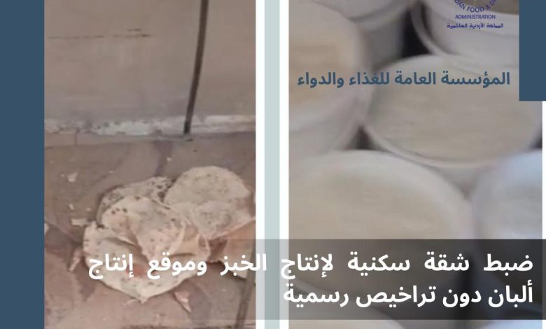 ضبطت المؤسسة العامة للغذاء والدواء وبالتعاون مع الإدارة الملكية لحماية البيئة شقة سكنية في الزرقاء، جرى تخصيصها من قبل القائمين عليها لغايات إنتاج الخبز دون الحصول على الموافقات والتراخيص الرسمية اللازمة، وفي ظروف صحية غير مطابقة للاشتراطات والمعايير المعتمدة.