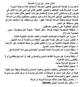 دعت وزارة الصحة المرشحين للتعيين المدرجة أسماؤهم إلى مراجعة مديرية الموارد البشرية/قسم التوظيف والتعيين في الطابق الثاني من مبنى الوزارة في طبربور قرب مستشفى الأمير حمزة، لاستكمال إجراءات التعيين خلال عشرة أيام من تاريخه، مصطحبين الوثائق المطلوبة بنسختين مصدقتين.